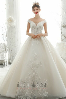 Свадебное платье длинный С плеча качели Природные Талия крышками рукава Королевский поезд